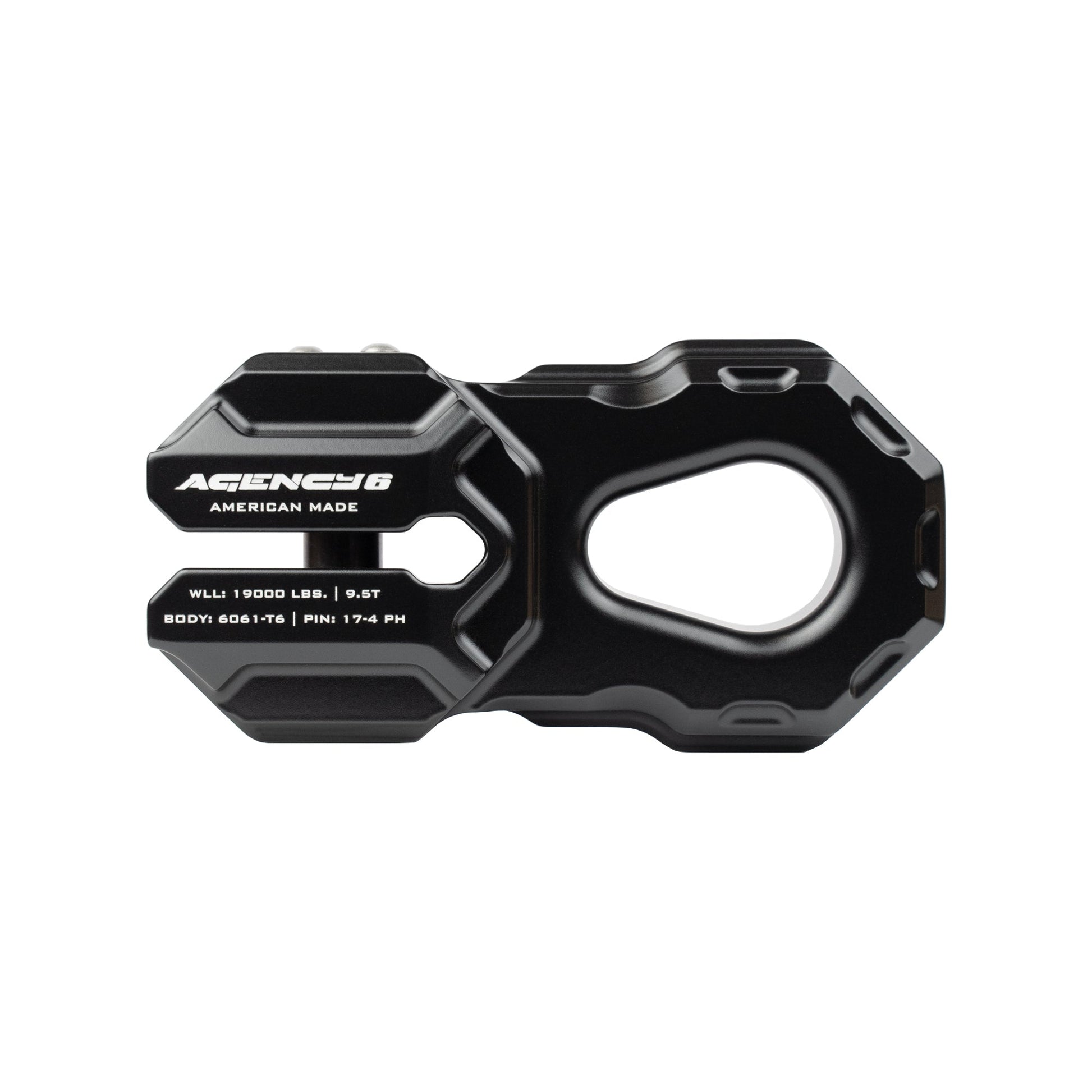 Field serviceable winch attachment made from US Certified 6061 T6 CNC machined aluminum with a 17-4 hardened stainless pin.