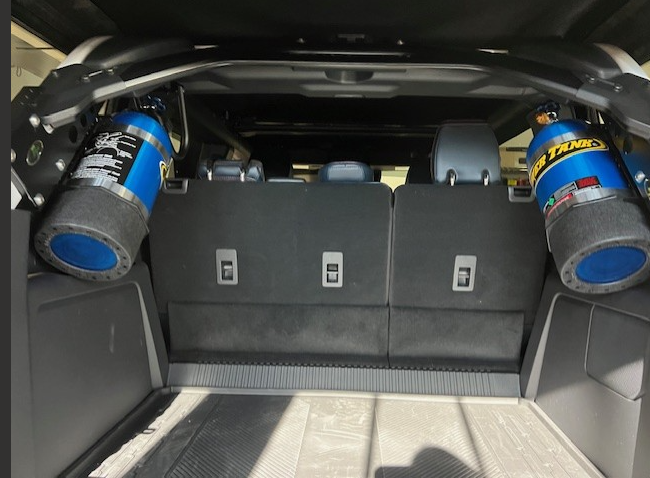 The Bronco Raptor Roll Bar Mount hangs your 5 lb or 10 lb Power Tank up and out of the way, maximizing space in your Bronco's cargo area. This bracket was developed with the 4 door Bronco Raptor in mind but works with all 4 door Broncos (6th gen 2021+).