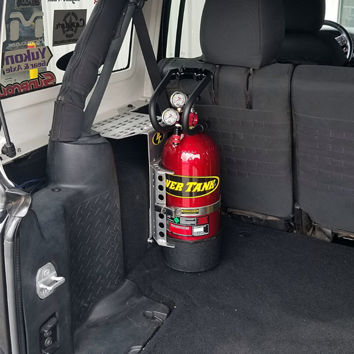 It locates your 10, 15, or 20 lb. Power Tank in a perfect position behind the rear seats and under the roll bar, right over your wheel well. This makes your regulators easier to reach and provides a more secure mount than our outgoing JKU Drop Down Bracket. You'll also notice that we cut a MOLLE pattern on the top plate. This allows you to attach MOLLE compatible bags to store your tire inflator and other tools for quick access. For a behind the scenes look at how we developed this new bracket, check out our blog post!