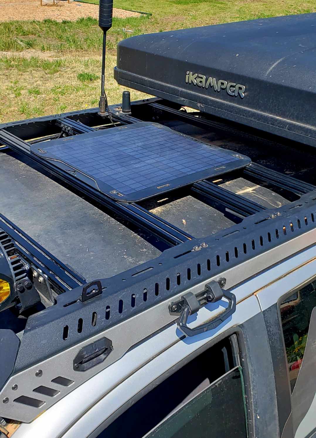 Choose the size of your solar system by adding as many 45 watt solar panels as needed to your UPTOP roof rack. The rugged construction of the solar panels combined with the rigidity of the aluminum backplate even allows you to stack gear on top of the panels without causing any damage.