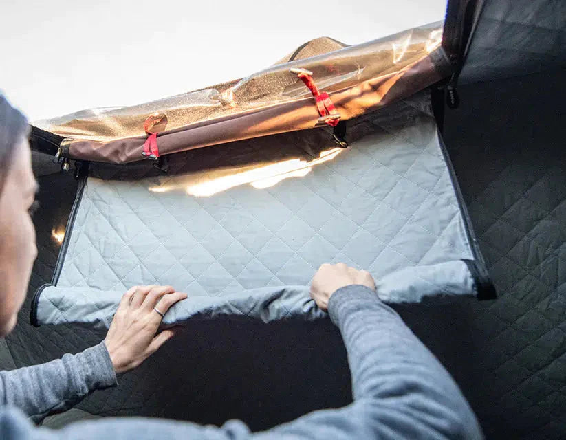 Love spending time outdoors and camping through wind, rain, and snow at any temperature? This quilted tent liner blocks drafts of air and retains body heat for cozy nights in your iKamper RTT. Takes less than five minutes to install and grants better insulation instantly.