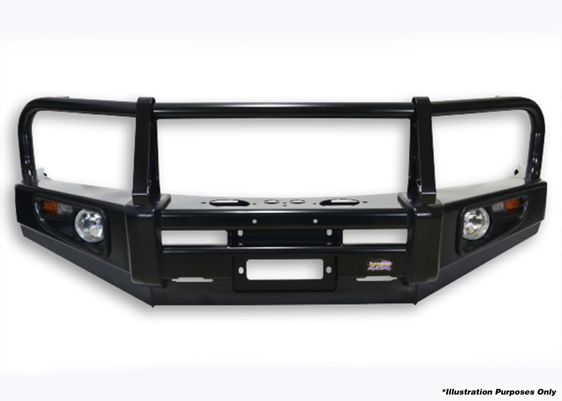 Manufactured from high quality structural steel, Dobinsons bull bars are CNC cut, bent and welded for accurate fitment, optimum strength and durability. Features vary by bumper model, but may include: Airbag and winch compatible, Driving light mounts, turn signal (Deluxe and Stainless bumpers only) and parking lights, Heavy duty black powder-coat finish, Dual re-enforced hi-lift jacking points, Dual aerial mounts, Polyurethane bumper overiders (deluxe and Stainless bumpers only), Re-enforced bull-bar wing tips, Separate winch cradle to chassis mounting system allows excess weight and load to be supported directly by the chassis, 3mm Thick Main Body, 4mm + 5mm Thick Bracket, 1.6mm Bash Plates (some models may not come with these), 51mm Upper loops on Classic Black and Classic Black Deluxe (60mm Land Cruiser 200 Series), 76mm center loop and 51mm side loops on Stainless Loop Deluxe models. All bumpers are supplied with a black finish. Stainless Loop Deluxe Bull Bars are supplied with a black finish and stainless steel loops. Some photos show painted bumpers on show vehicles for photography purposes. Color matching can be performed by your local automotive spray painter. Due to the additional weight when fitting a Bull Bar and/or Winch, the vehicle€™s ride height will be lowered. We suggest replacing the springs with a matched pair of springs to suit the requirement. Most bull bars are also equipped with center and side protection plates for the underside of the bull bar. A crucial feature to help protect vital vehicle components when off-road driving. Separate winch cradle to chassis mounting system allows the additional weight of the winch and winching load to be supported directly by the chassis. NOTE: Contact us for accurate information on bumper specifics before ordering if you have questions. Returned shipments will incur additional shipping and handling charges.
