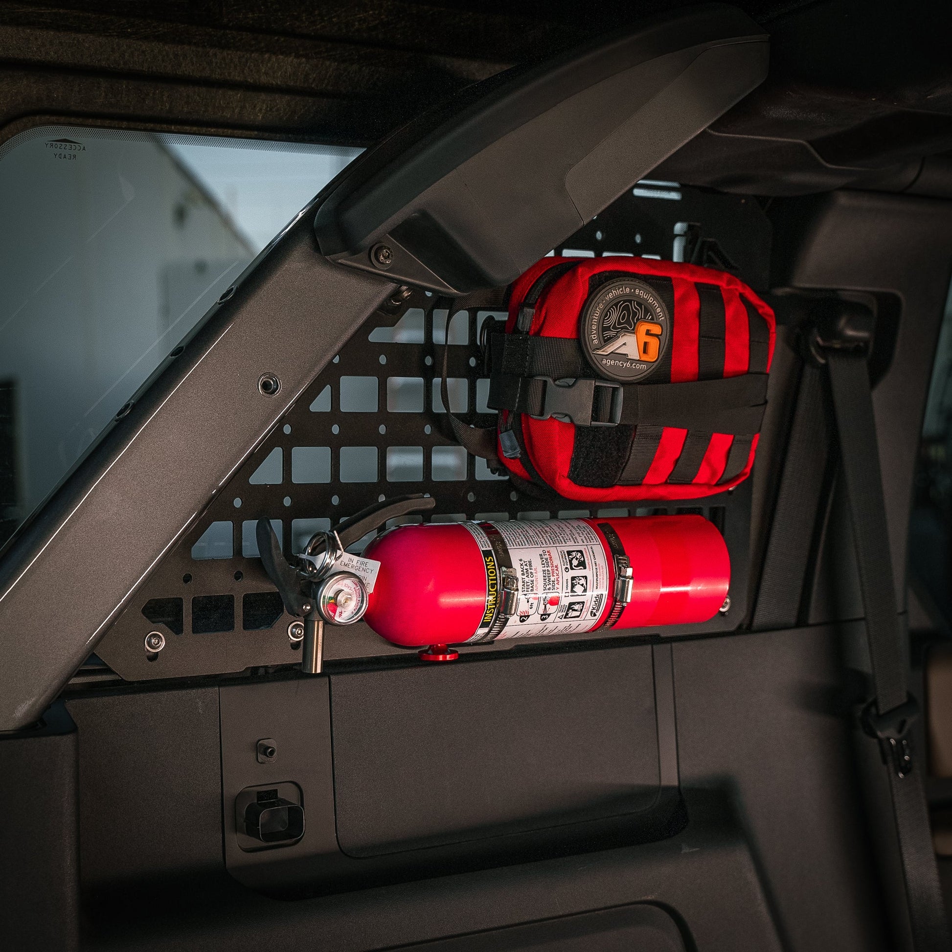 Tired of everything rolling around back there? Want to keep important equipment at the ready? Add organization to your Bronco with the Agency 6 GRIDS panel. This rear storage solution gives you vertical real estate for mounting a variety of accessories. MOLLE pattern cutouts allow for a range of camping and off-road components to be securely strapped directly to the panels. Slots on the perimeter are ideal for mounting lights, or as additional strap points. Panel bolts through the plastic directly into existing metal structure utilizing machined aluminum adapters.