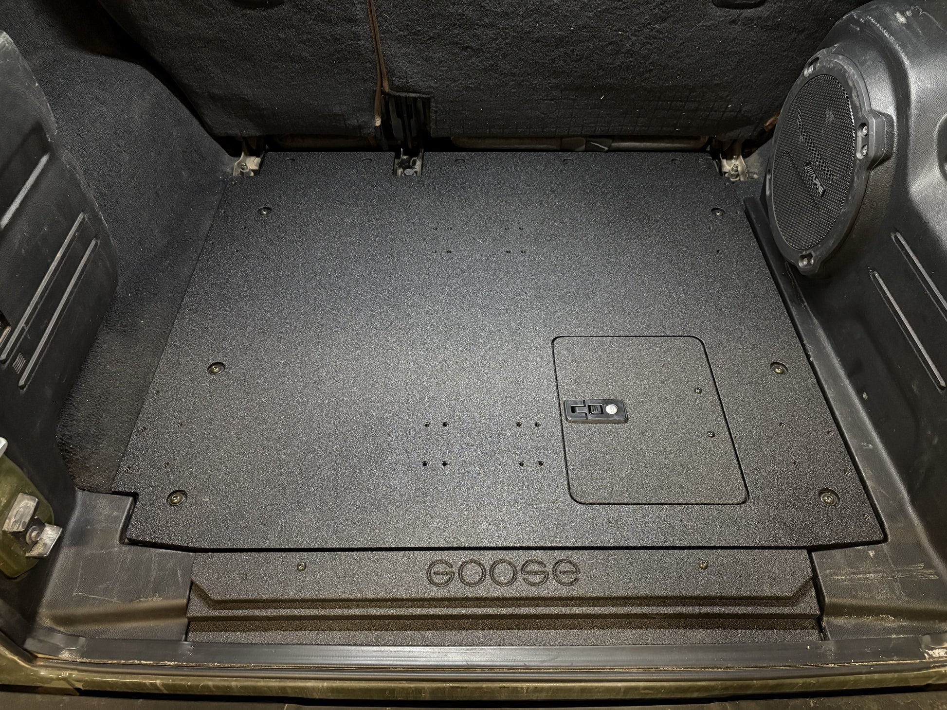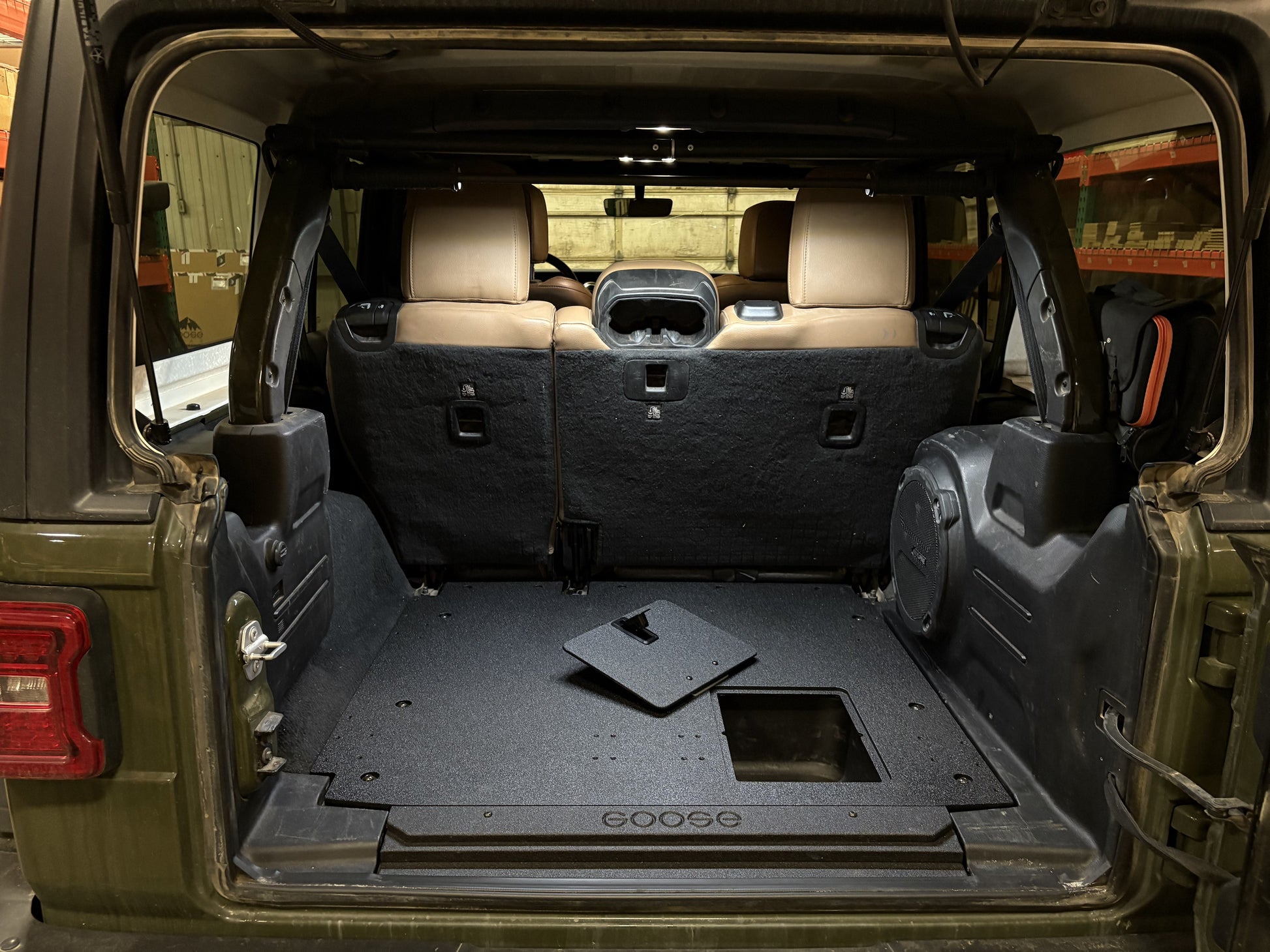 The Jeep Wrangler JLU Rear Plate System is designed and built with industrial grade plywood and coating using our propriety spray methods for superior durability and wear resistance. This Plate System allows the user to easily install various Jeep Specific modules including single and double drawer systems as well as the ever-famous Icebox module and the CampKitchen 2.3 for Jeeps. The plate system also makes a great platform for securing your own storage or gear including dog crates, other fridge slide brands, etc.