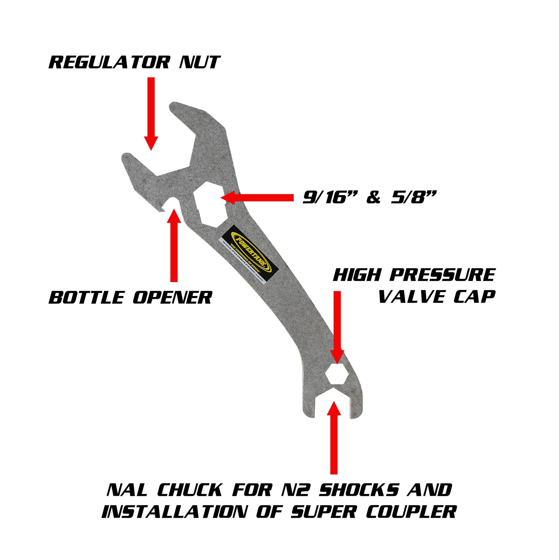 Fourth generation to the popular and useful Power Tank wrench. This new design keeps the slim design of the version 1.0 with all the useful features of both previous designs in a new sleeker shape. Replace your regulator (1-1/8"), tighten 9/16" & 5/8" fittings, R&R NAL chuck on N2 shocks (11/16"), R&R hex high pressure valve caps (3/8"), and of course remove caps from your favorite bottled beer. Stainless steel. Features a built-in bend point to prevent over tightening of the regulator nut. Regulator nuts should be two-finger tight.