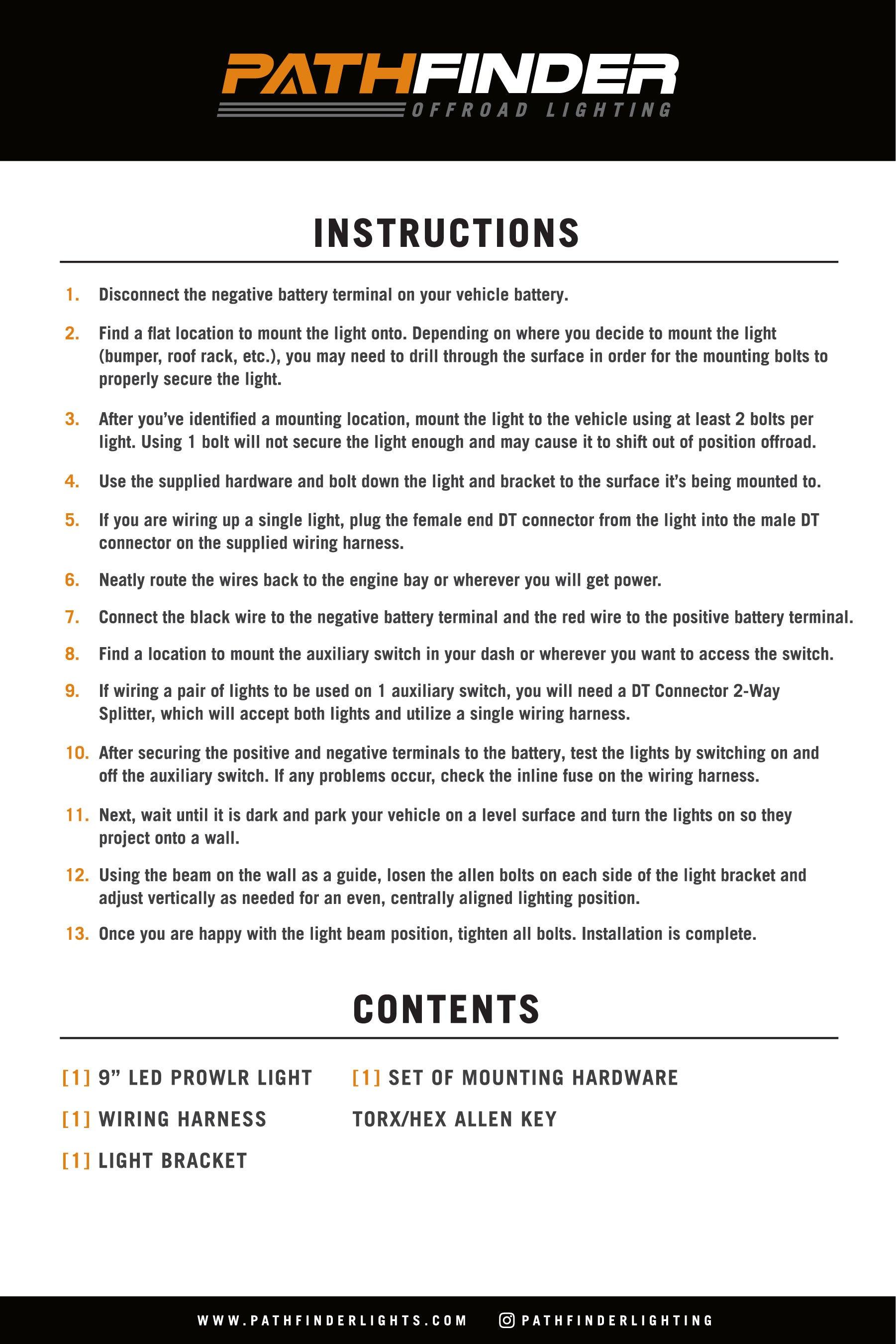 - After you’ve identified a mounting location, mount the light to the vehicle using at least 2 bolts per light. Using 1 bolt will not secure the light enough and may cause it to shift out of position offroad.