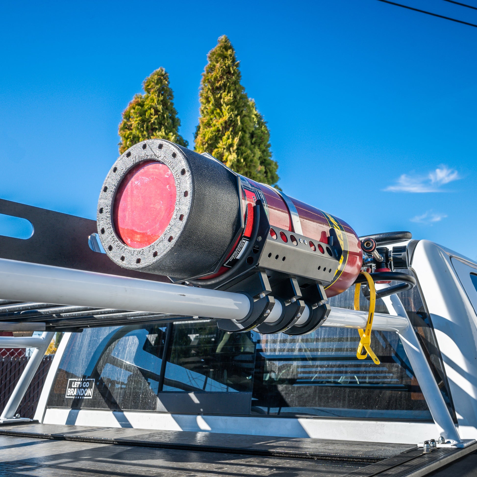 Roll Bar Clamps Black Power Tank. With our mounting brackets these ABC (Aluminum Billet Clamp) Clamps make mounting your Power Tank easy and clean. The compact design allows it to fit between the roll bar and the inside of the rig. The allen socket button head bolts are nothing less than stainless steel. The grip groove inside the clamp keeps shims from shifting during heavy offroad racing.
