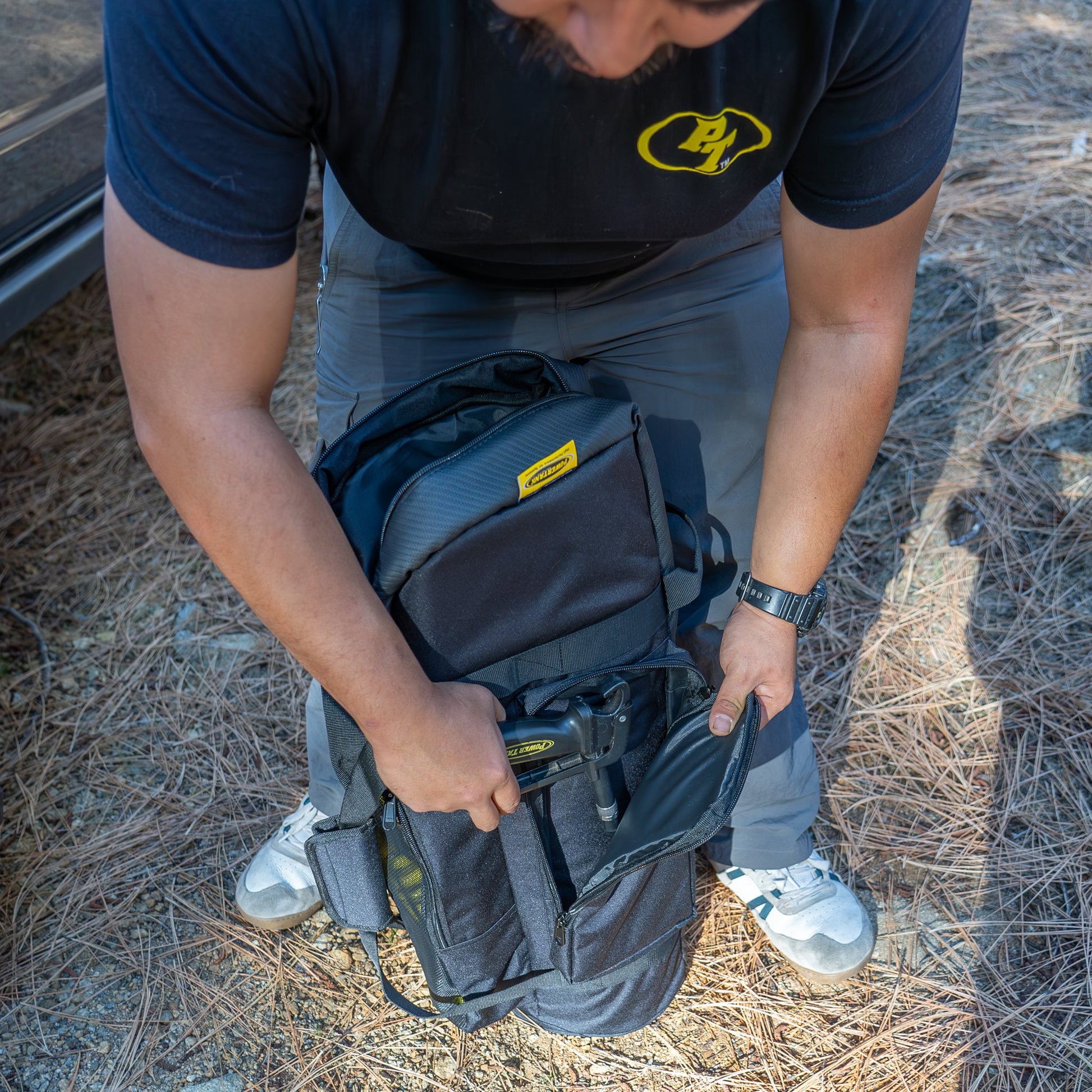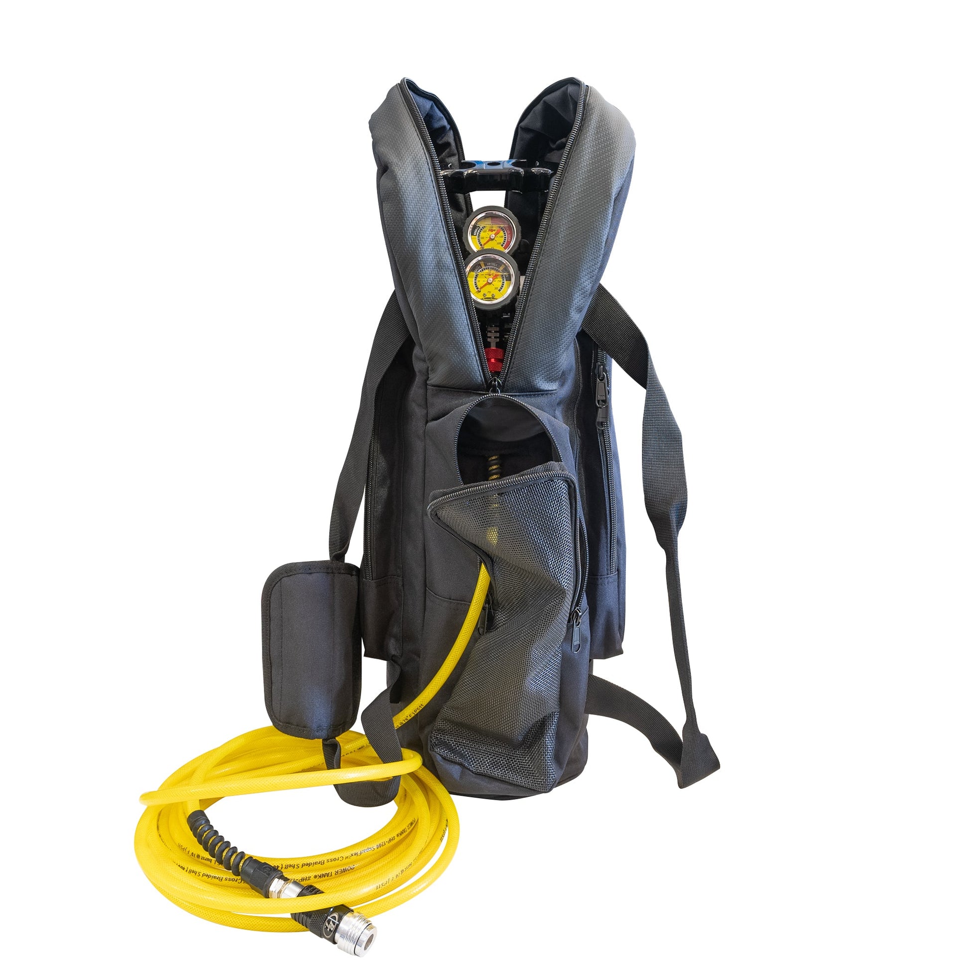 The new and improved Speed Bag for 10 lb Power Tanks is perfect if your Power Tank is more of a mobile tool being carried from place to place or from vehicle to vehicle. Features a main compartment with 1/4 inch foam padding, larger front mesh hose pocket with pass-through, and two zippered side pockets for your Ventoso Tire Inflator and other tools. With the hose-pass through, your Power Tank is always ready to go. Unzip the top for full access to your regulator and valve and pull the hose out of the mesh pocket. Made of abrasion resistant ballistic nylon with an equally hardwearing carbon top cover, heavy duty nylon carry handles, and YKK zippers.