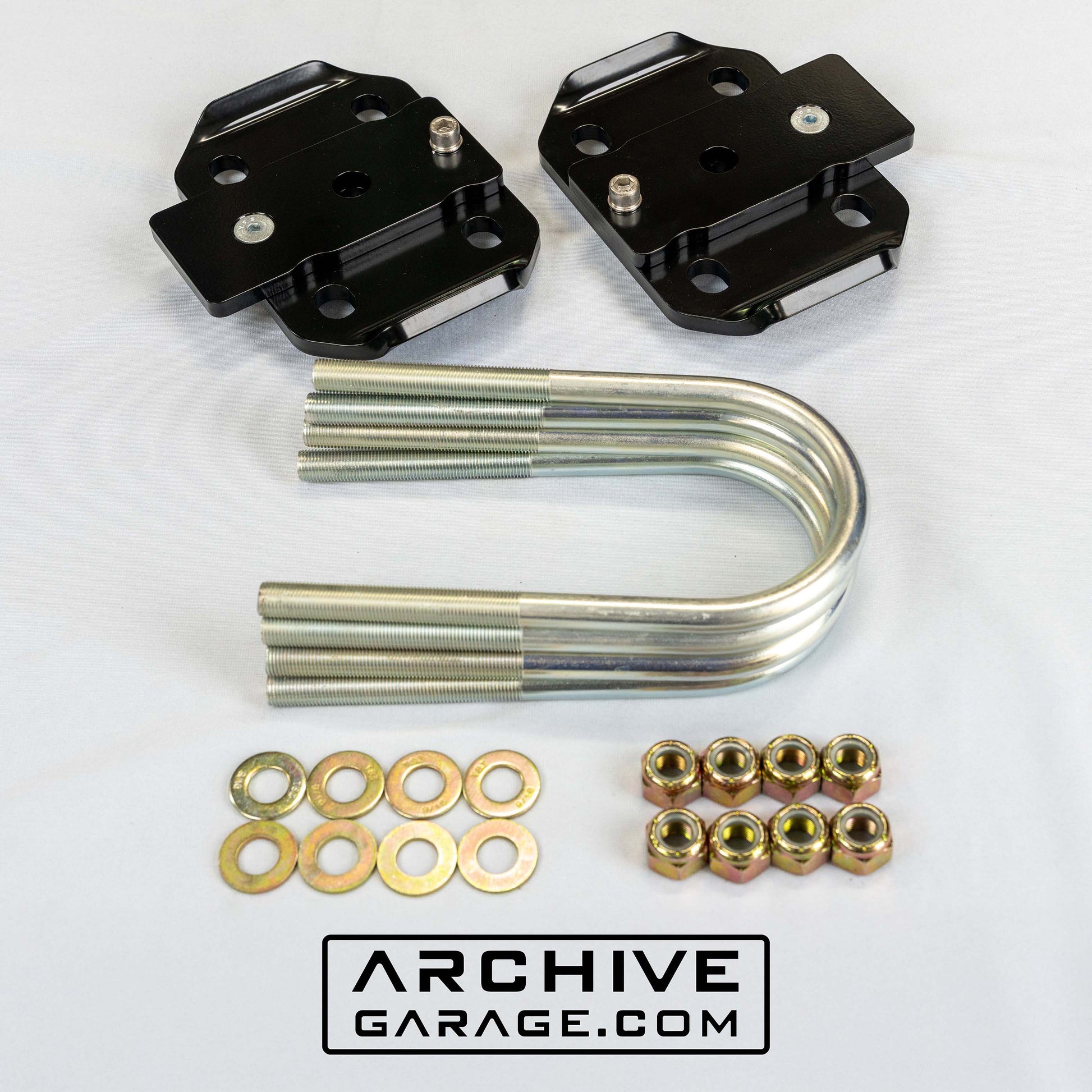 Archive's Stealth HD U-bolt flip kit fits stock 60mm (2.375") to 2.5" wide springs max, bolts are kept tight to pack to prevent your leaves from rotating out of alignment.