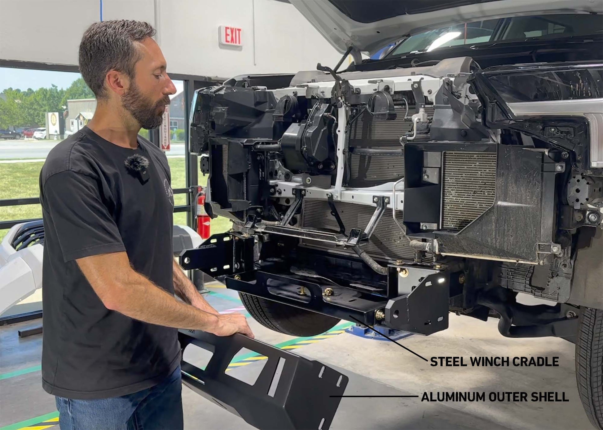 Our Tundra hidden winch bumper completes the front end of your truck by adding much needed recovery points, winch capabilities, strength, and of course, good looks. In keeping with tradition with what we're known for at Backwoods, this bumper uses our 2 piece hybrid design with an aluminum outer shell and a steel inner winch cradle. This keeps the overall package both extremely light and strong. The aluminum outer shell keeps things super light weight and will not rust, while the steel inner winch cradle gives you superior strength for recoveries and winching.