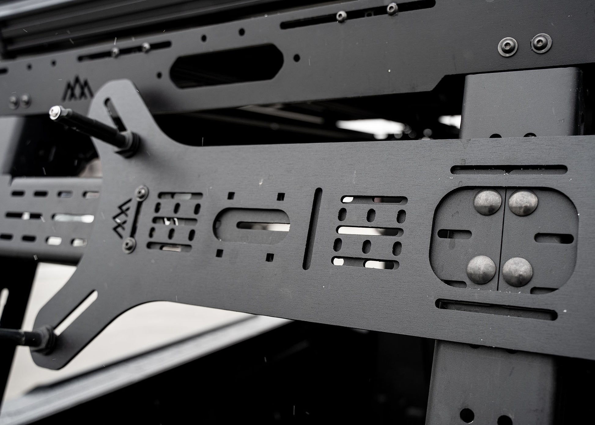 Our Universal "Dogbone" mount is an all aluminum panel that allows you to easily mount your traction boards, Rotopax, or other gear on any roof rack, bed rack, or flat surface. We have special cutouts that accept Maxtrax mounting pins and other similar traction board mounts. We also have matching cutouts to the Rotopax mounts, allowing a no drill solution to carrying extra fuel/water.